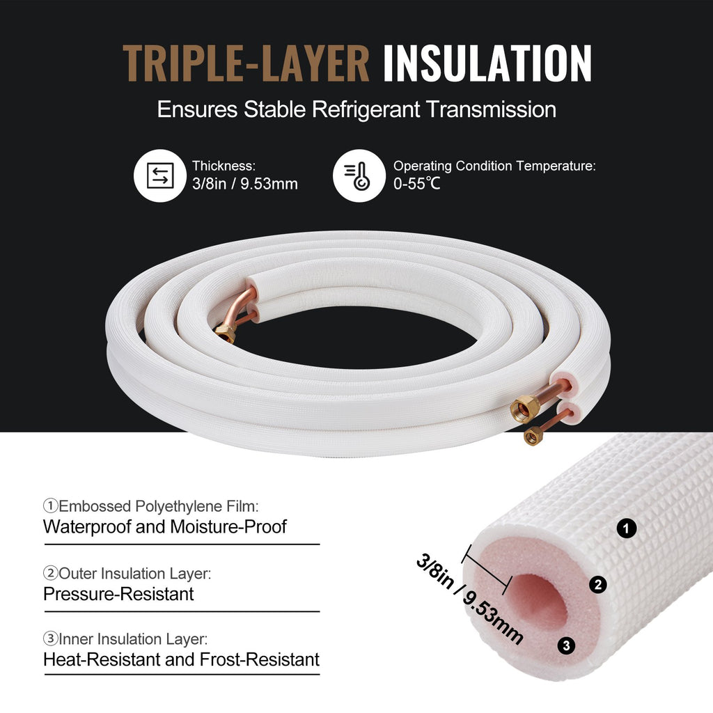 VEVOR 4876.8mm Mini Split Line Set, 6.4 & 12.7mm O.D Copper Pipes Tubing and Triple-Layer Insulation, for Air Conditioning or Heating Pump Equipment & HVAC with Rich Accessories 18ft Connection Cable