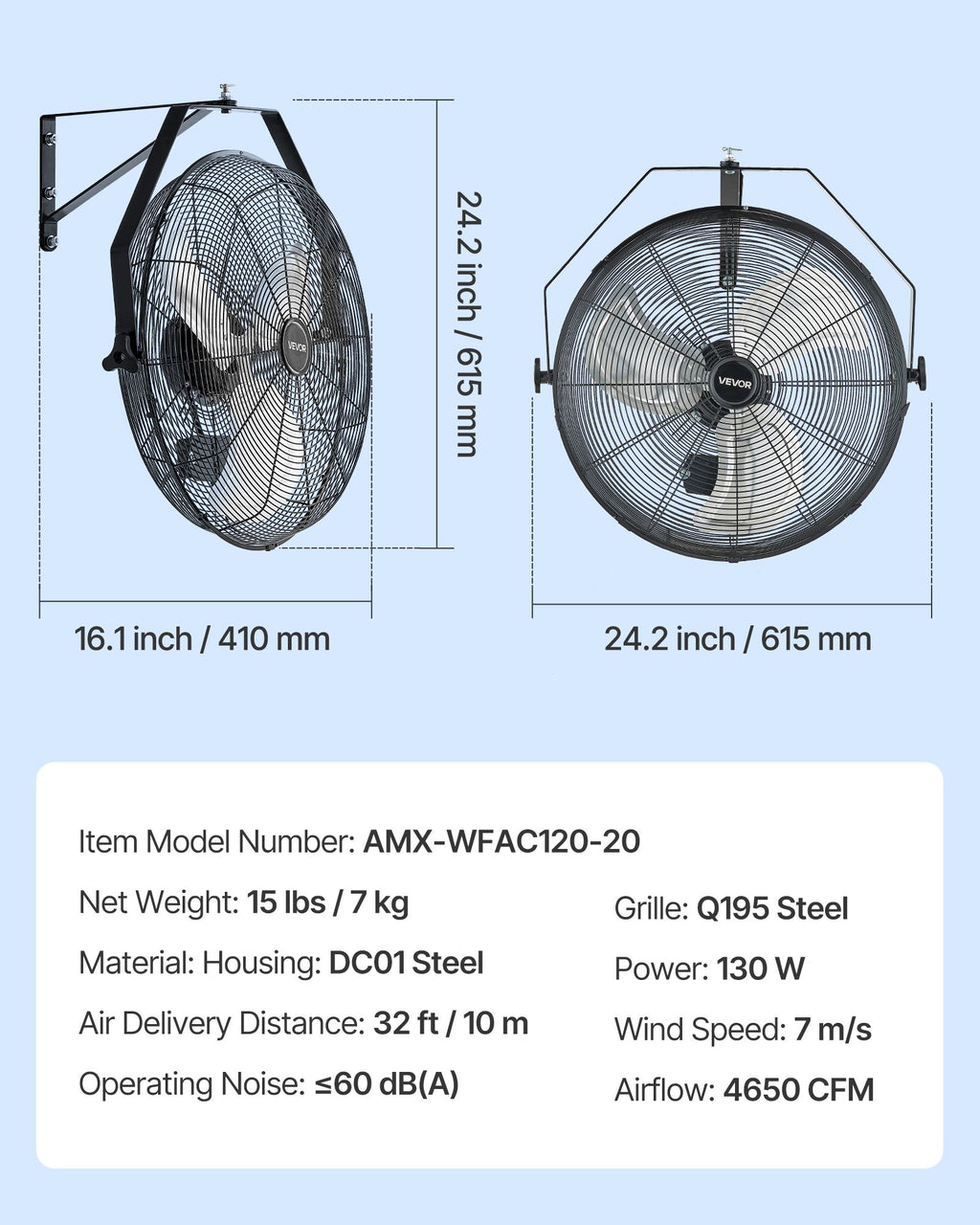 VEVOR 615mm Industrial Wall Mount Fan 3 Speed 4650 CFM for Garage Greenhouse
