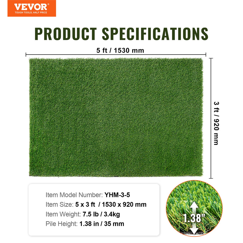 VEVOR Artifical Grass, 3 x 5 ft Rug Green Turf, 1.38" Fake Door Mat Outdoor Patio Lawn Decoration, Easy to Clean with Drainage Holes, Perfect For Multi-Purpose Home Indoor Entryway Scraper Dog Mats