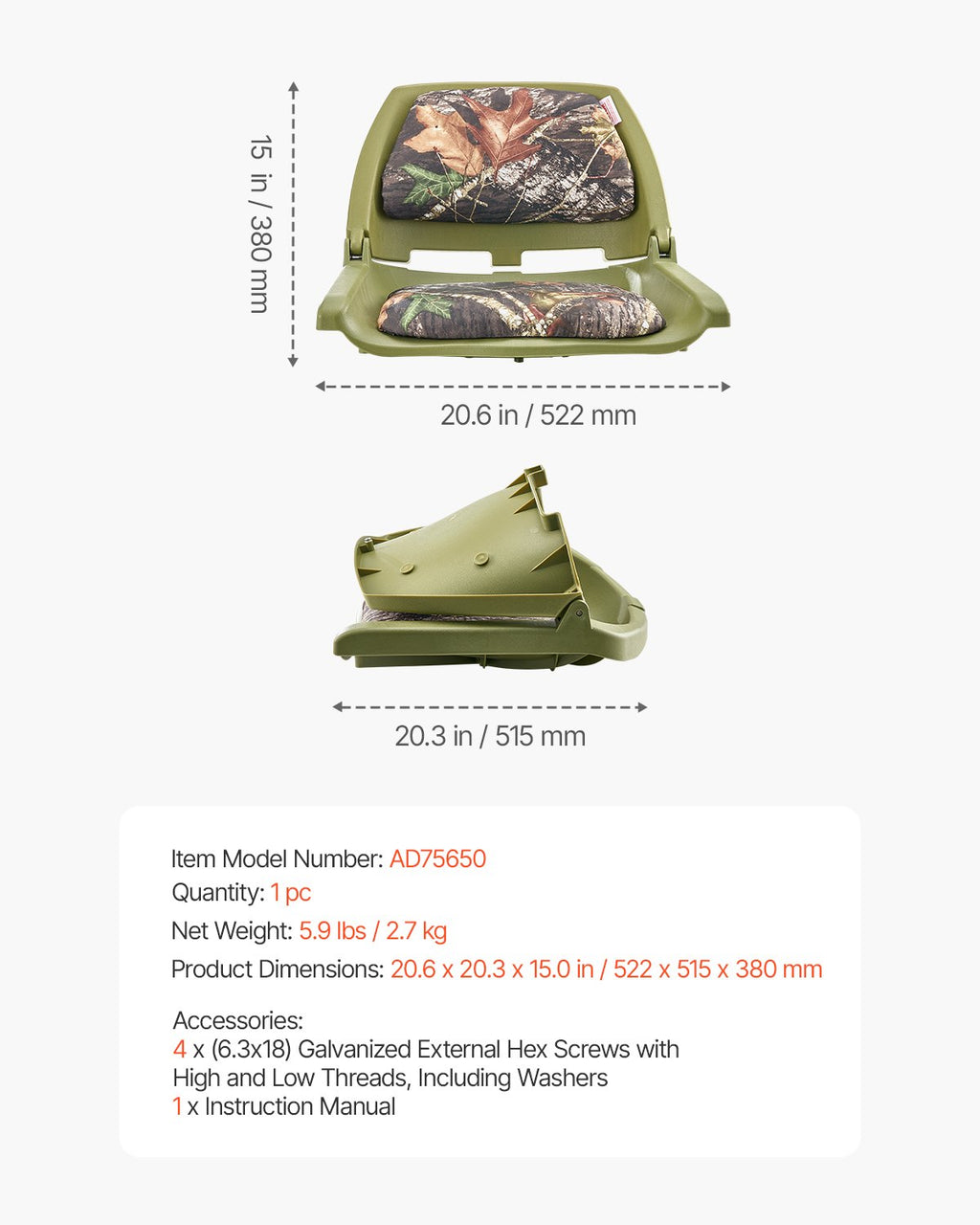 VEVOR Boat Seat, Low Backrest, Folding Fishing Boat Seat with Thickened Sponge Cushion & PU Polyester Fabric, Strong PP Frame, Flip Up Boat Seat for Fishing Boats, Yachts, Ships, Camouflage Color