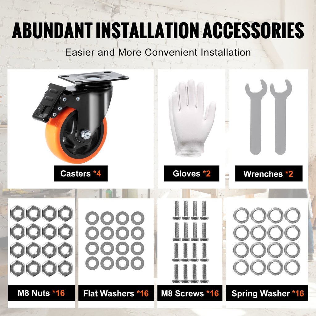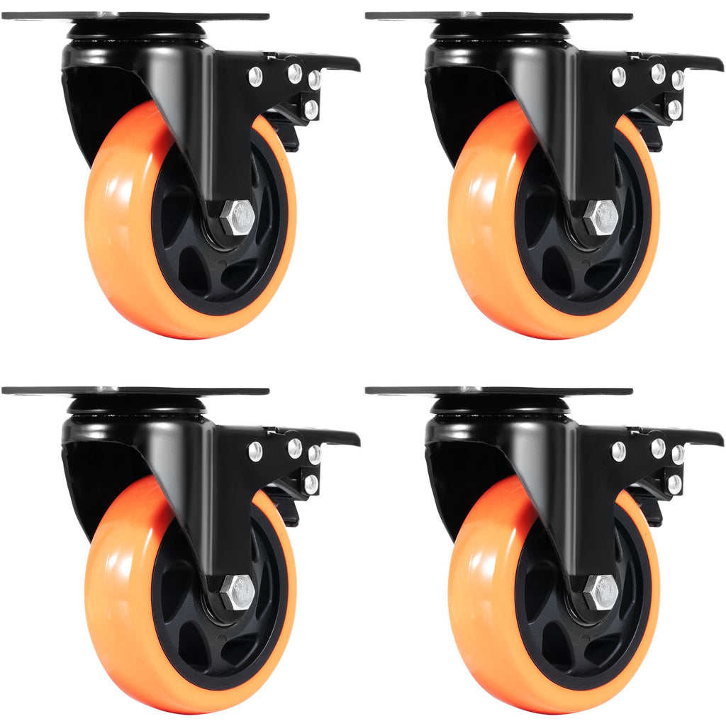VEVOR Caster Wheels, 101.6 mm Swivel Plate Casters, Set of 4, with Security A/B Locking No Noise PVC Wheels, Heavy Duty 159 kg Load Capacity Per Caster, Non-Marking Wheels for Cart Furniture Workbench