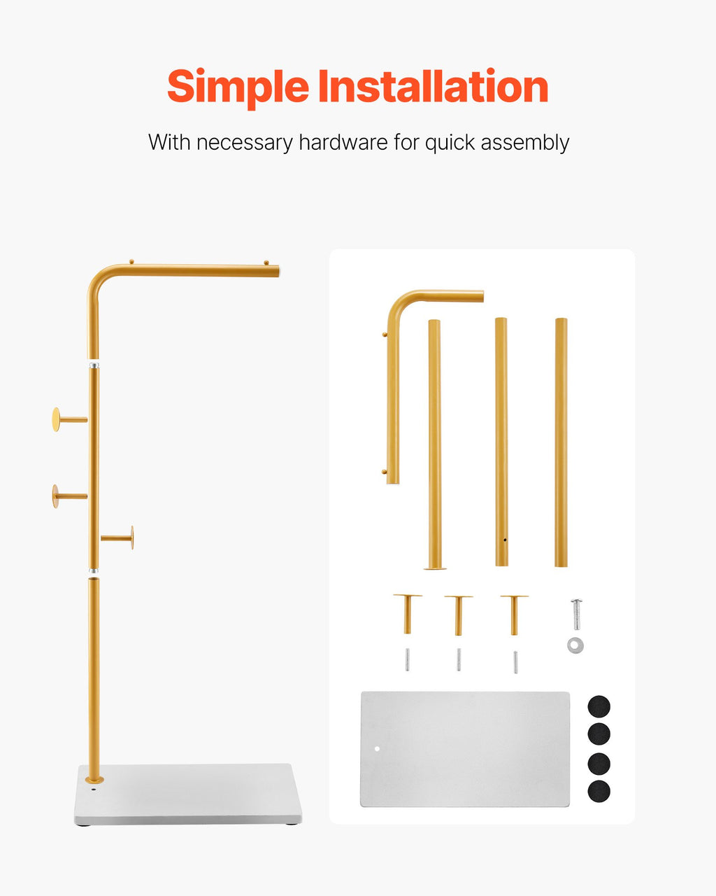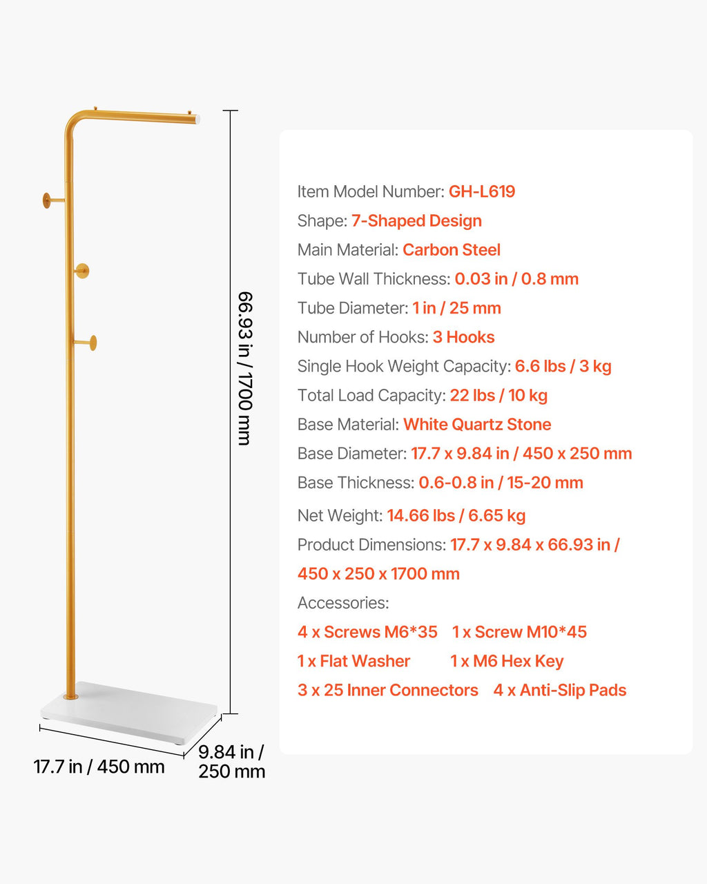 VEVOR Coat Rack, Freestanding Coats Rack Stand with Quartz Stone Base & 3 Round Hooks, Free Standing Hall Coat Tree for Entryway, Bedroom, Living Room, Stylish Clothes Hanger Stand for Coats, Hat, Bag