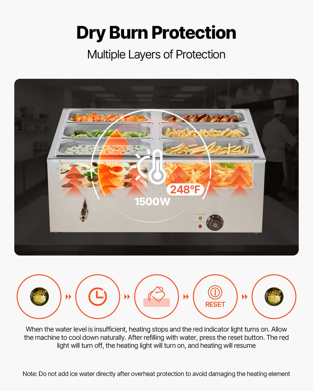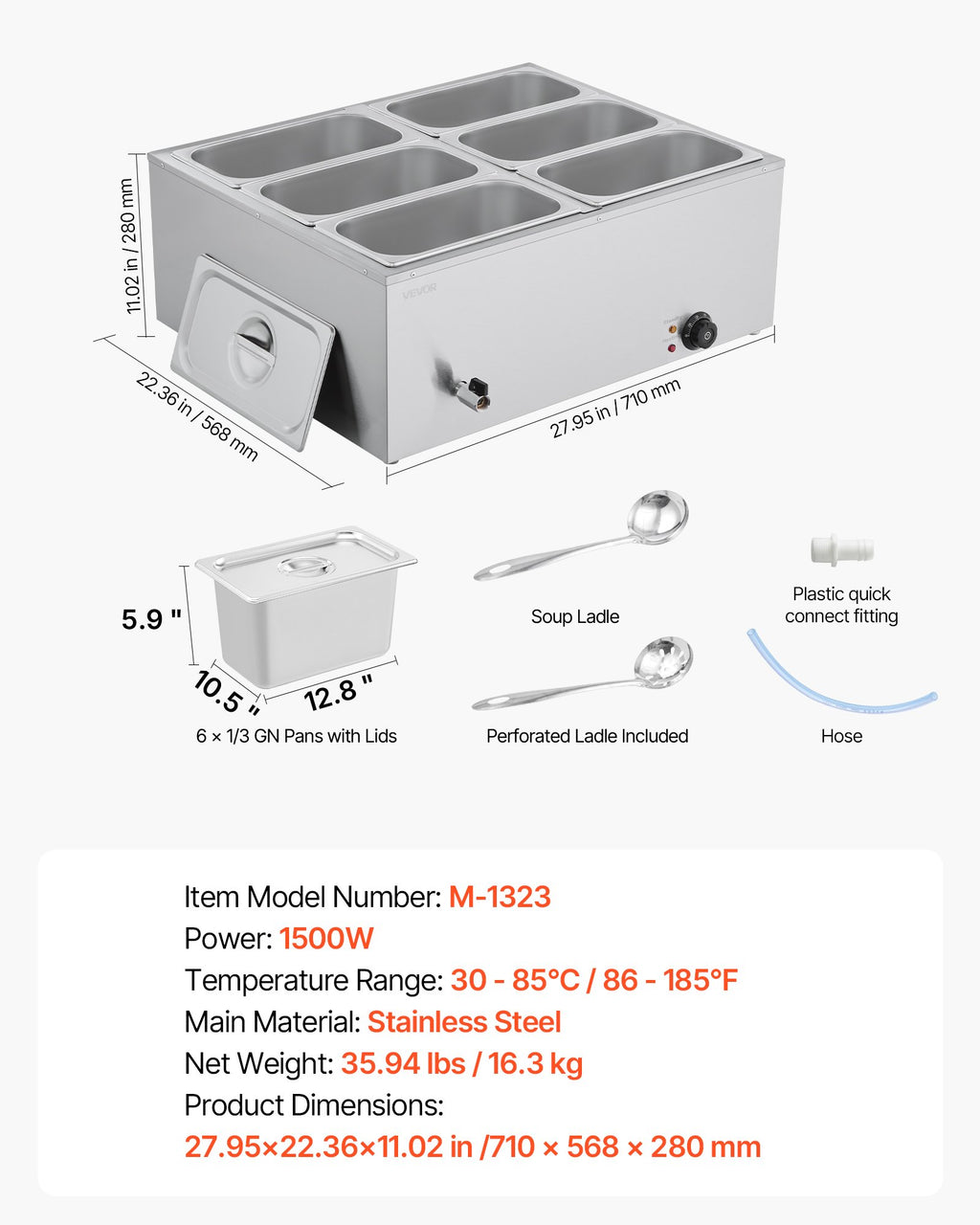 VEVOR Commercial Food Warmer, 1500W Electric Stainless Steel Steam Food Warmer with Lid, 6-Pan Fast Heating Countertop Buffet Bain Marie with Soup & Perforated Ladles, for Catering, Restaurant, Party