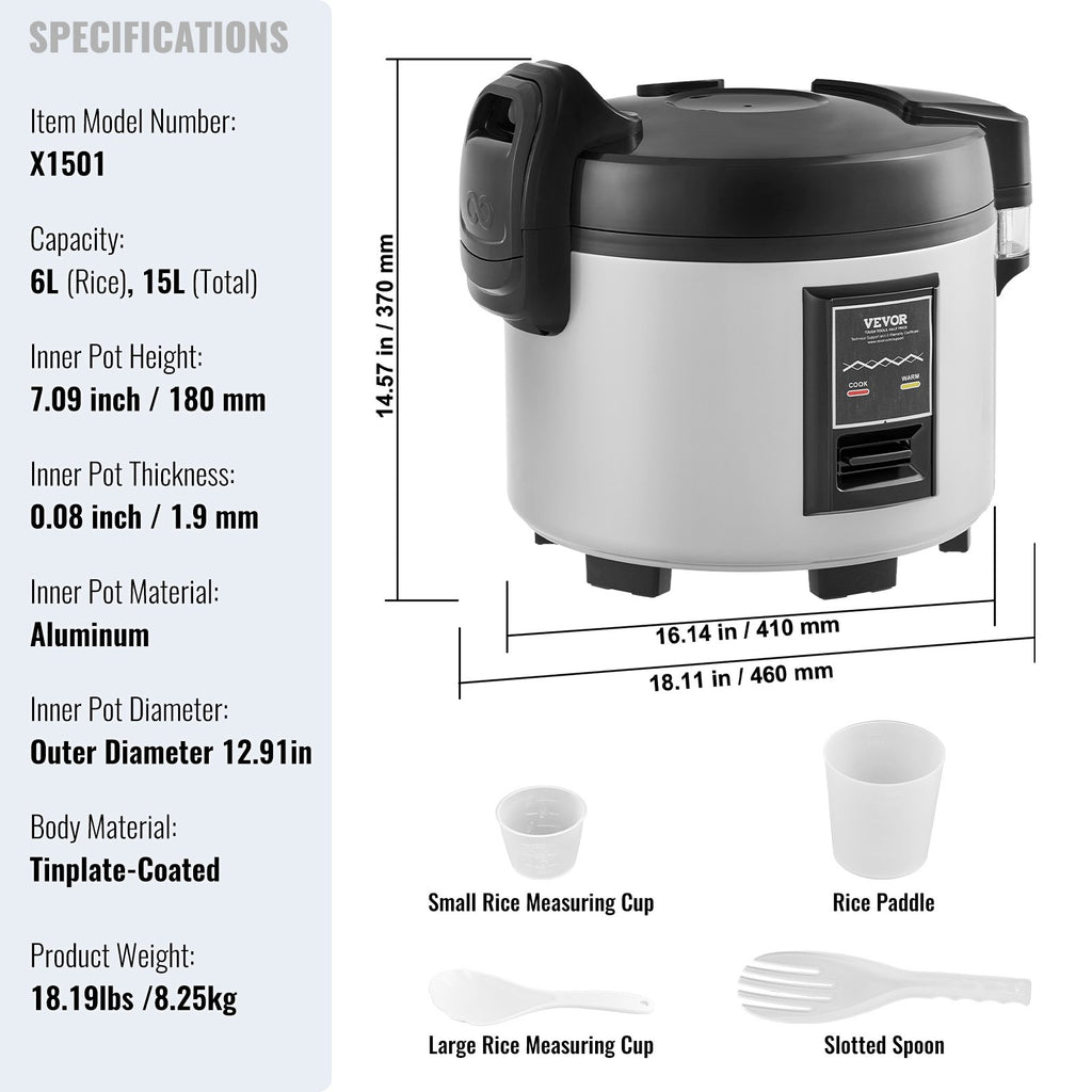 VEVOR Commercial Rice Cooker, 70-Cup Rice Cooker, 15 Liter Large Rice Cooker and Warmer with Nonstick Inner Pot, Fast Cooking and 12-Hour Keep Warm, with Rice Cup and Paddle, for Restaurant