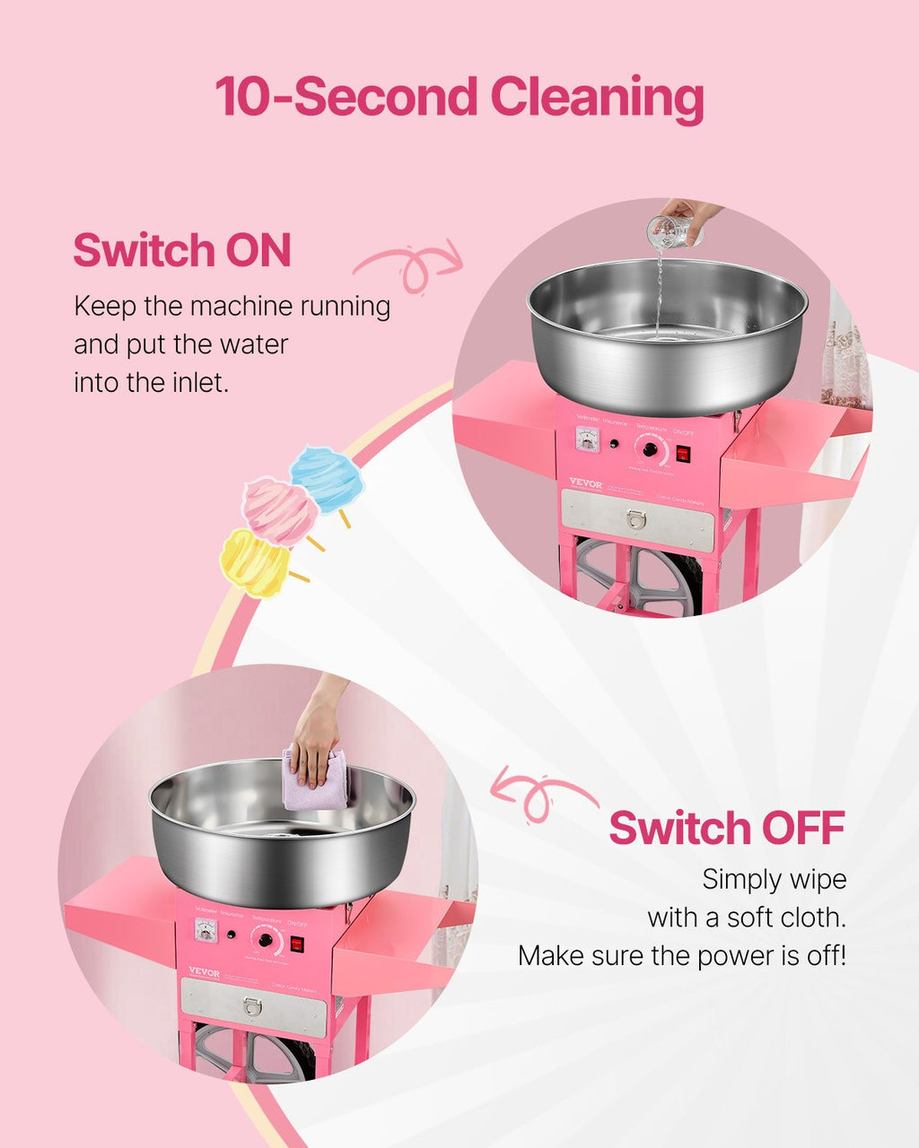 VEVOR Electric Cotton Candy Machine with Cart, 1000W Commercial Candy Floss Maker with 52cm in Stainless Steel Bowl, Sugar Scoop, and Drawer, Easy to Use, for Home, Kids Birthday, Family Party, Pink