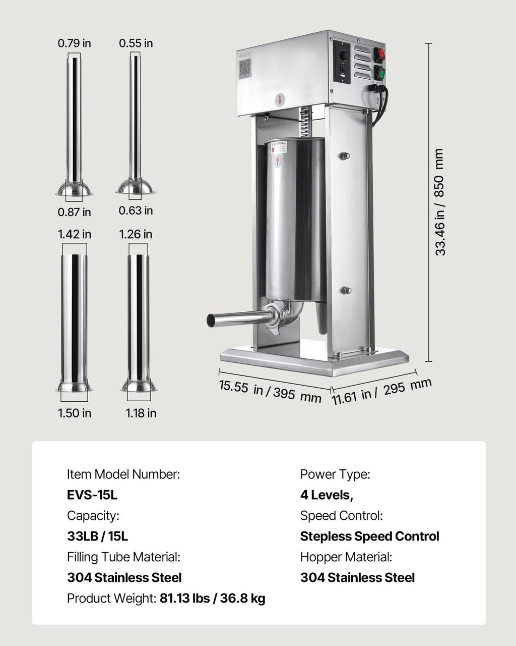 VEVOR Electric Sausage Stuffer, 33 LBS / 15 L Vertical Meat Stuffer, Stepless Speed Control and Foot Pedal, Stainless Steel Heavy Duty Sausage Filler with 4 Stuffing Tubes, for Commercial & Home Use