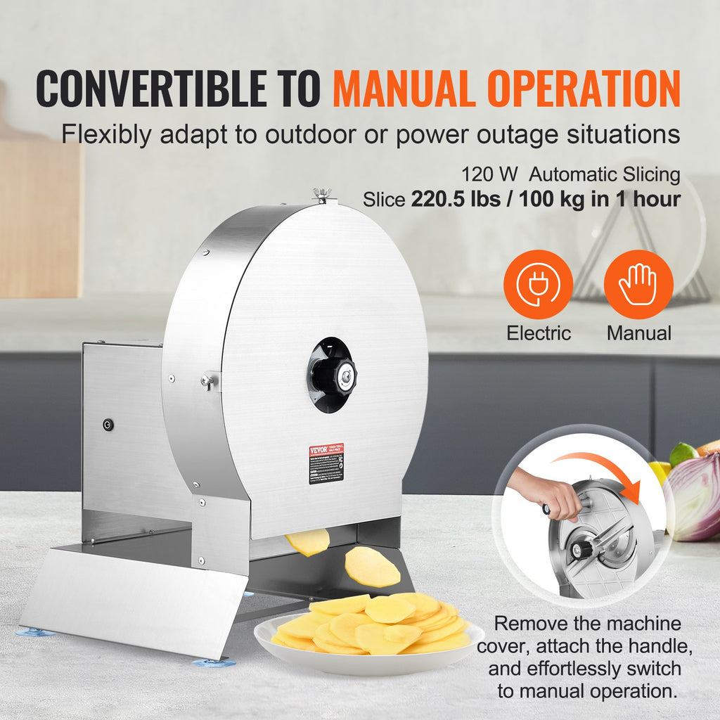 VEVOR Electric Vegetable Slicer, 0-0.5"/0-12mm Thickness Adjustable Commercial Slicer Machine, Convertible to Manual, Stainless Steel Food Cutter Slicing Machine, Large Feed Port for Potato, Tomato