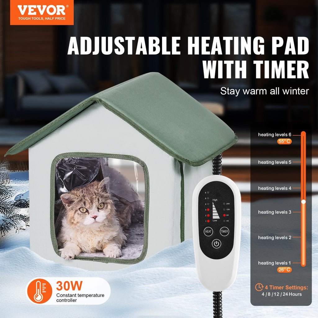 VEVOR Elevated Heated Cat House, Outdoor Kitty Shelter with Timer, 600D Oxford Cloth Foldable Cat Shelter with Heated Pad for Winter to Stay Warm and Cozy, Green Small