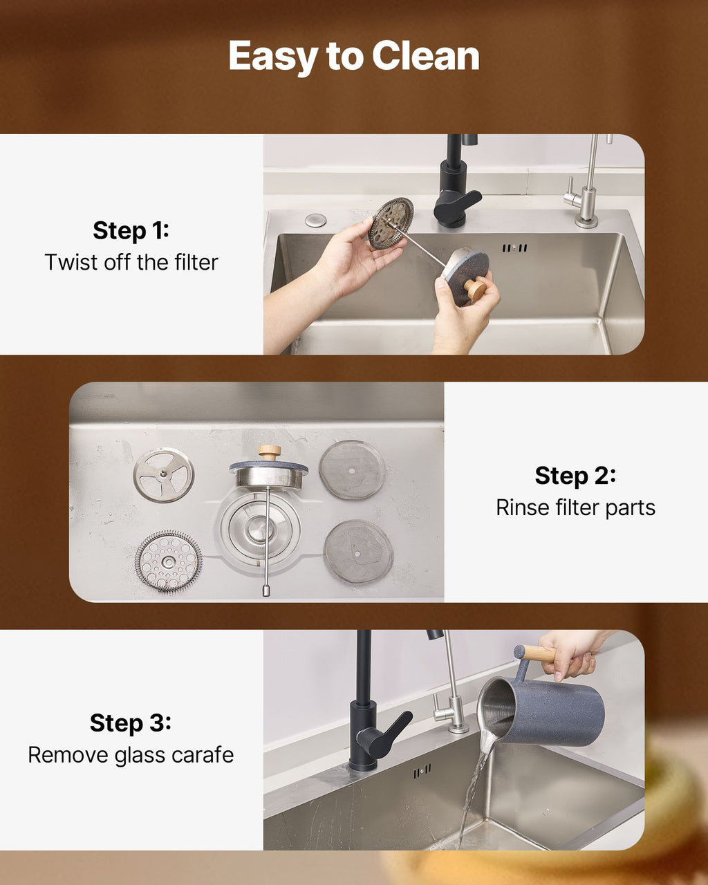 This French coffee press features a smooth stainless steel surface, removable filter and plunger for effortless cleaning. All parts disassemble easily for deep cleaning and are fully dishwasher-safe