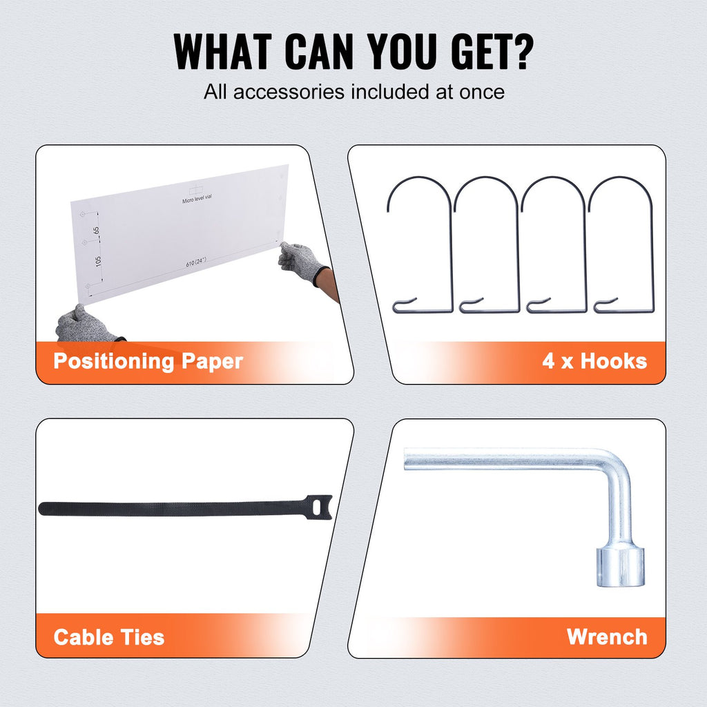The package includes positioning paper, hooks, cable ties, etc. This garage shelving heavy duty wall mounted is suitable for installation on concrete or wooden walls. If it's a stud wall, please check the hole distance and not suitable for installation on metal walls.