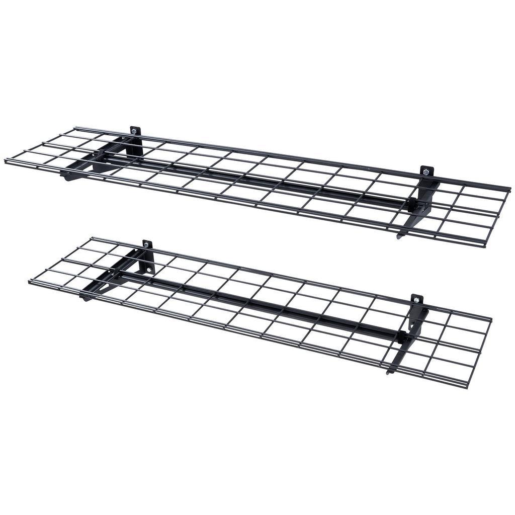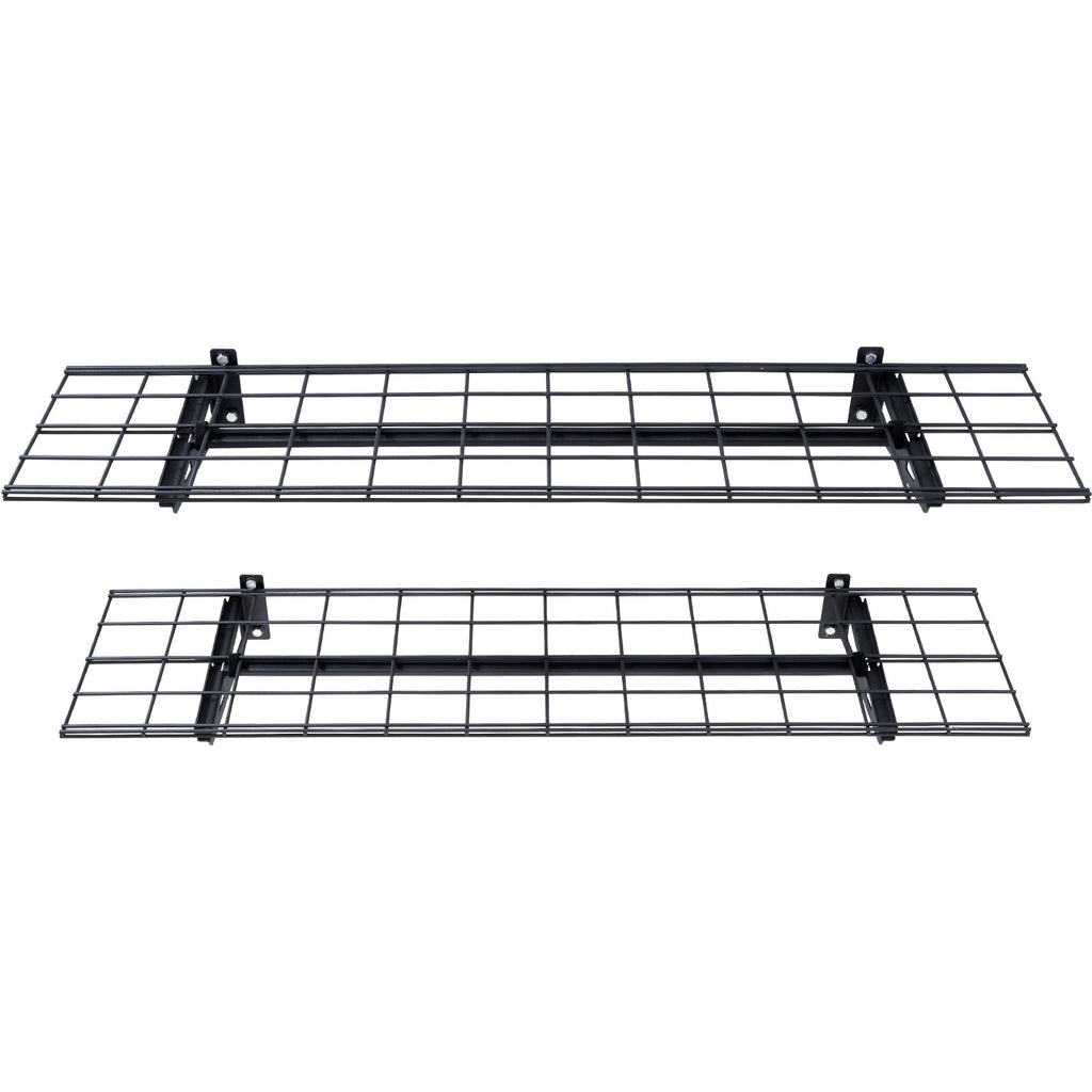 The garage shelving wall mounted is constructed entirely of metal with a sandblasted surface, featuring reinforced front-side beams and two additional steel wires measuring 48 x 12.3 x 4.5 inches (W x D x H) to accommodate more items.