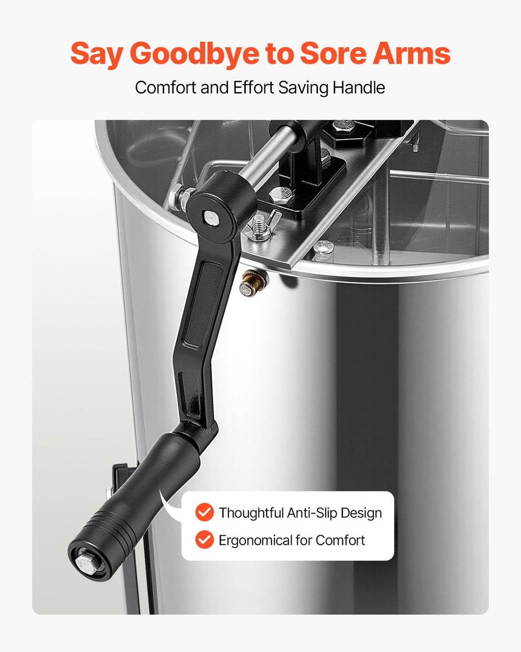 The manual honey extractor features an ergonomic crank with an anti-slip design makes manual operation more comfortable, reducing the effort needed for honey extraction.