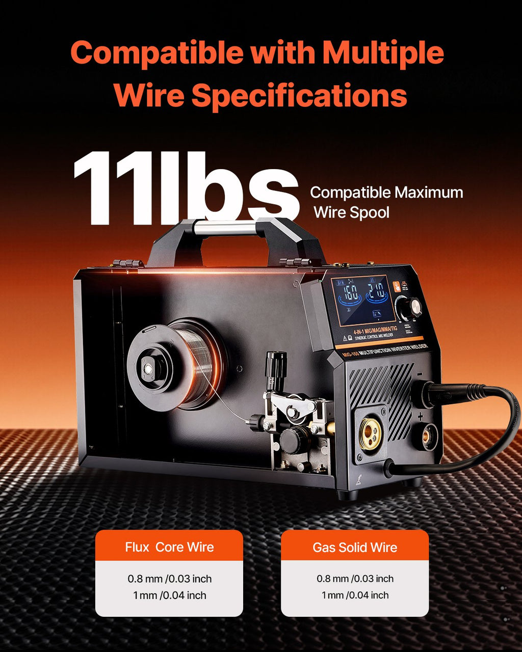 VEVOR MIG Welder, 160A Synergic Mig Welding Machine, 4-in-1 Gas MIG/Flux Core MIG/Stick/Lift TIG Multi-Process Welder Machine with IGBT Inverter Technology and LCD Screen Display