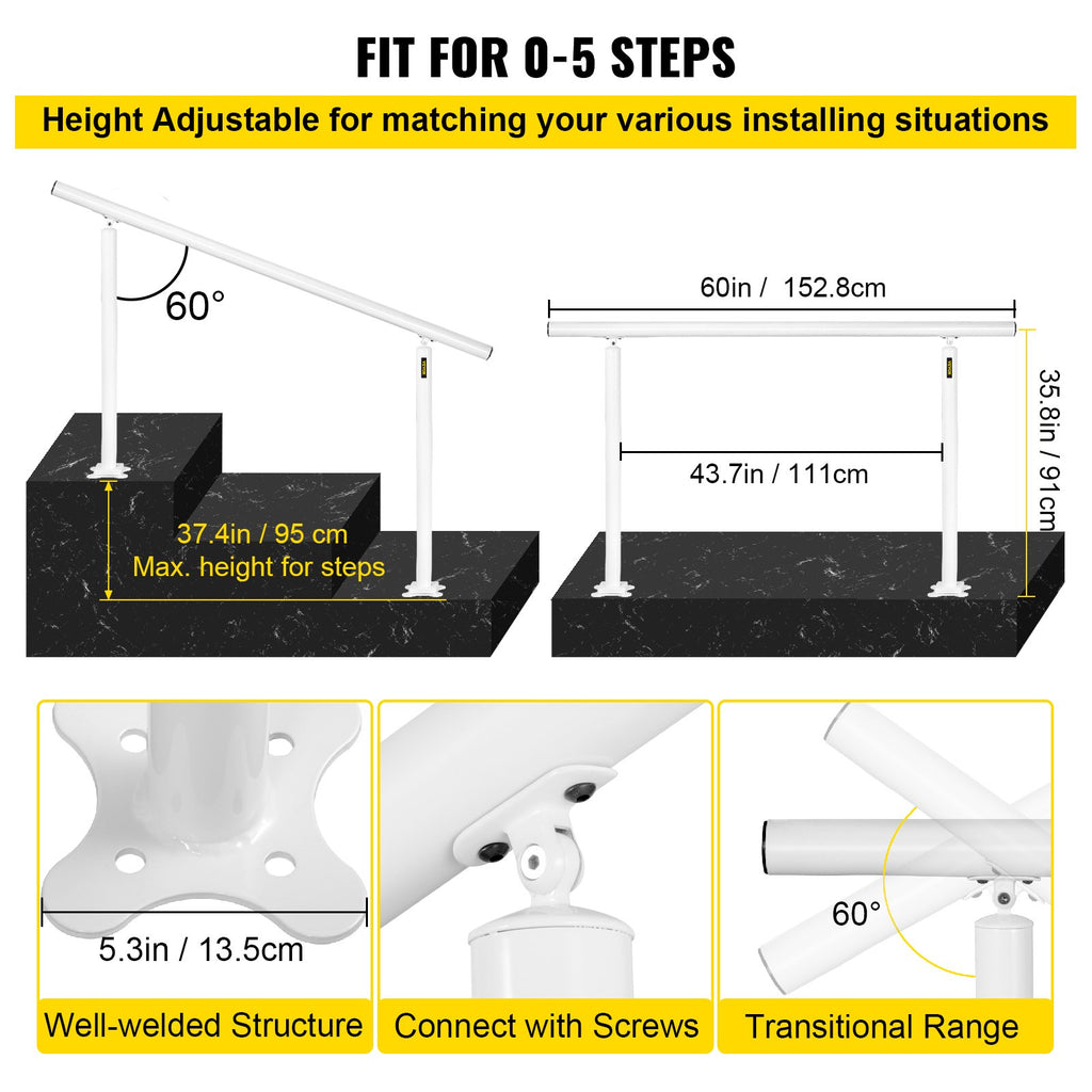 VEVOR Outdoor Stair Railing Kit, 5 FT Handrails 0-5 Steps, Adjustable Angle White Aluminum Stair Hand Rail for The Elderly, Handrails for Outdoor Steps