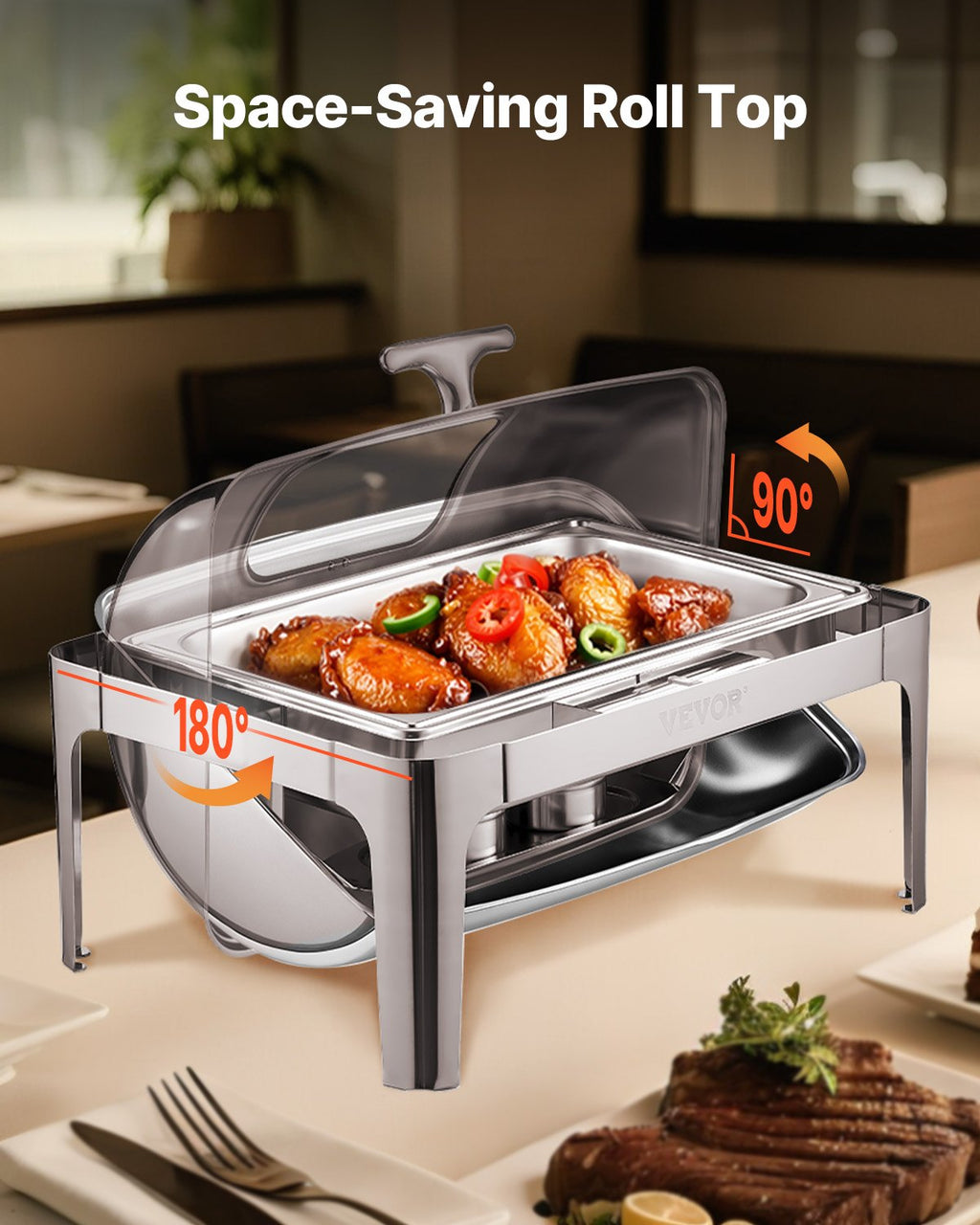 VEVOR Roll Top Chafing Dish Buffet Complete Set, 9 Qt 1 Pack Stainless Steel Chafer with 2 Half Size Pans, Rectangle Catering Warmer Server with Visible Lid Water Pan Folding Stand Fuel Holder, Silver