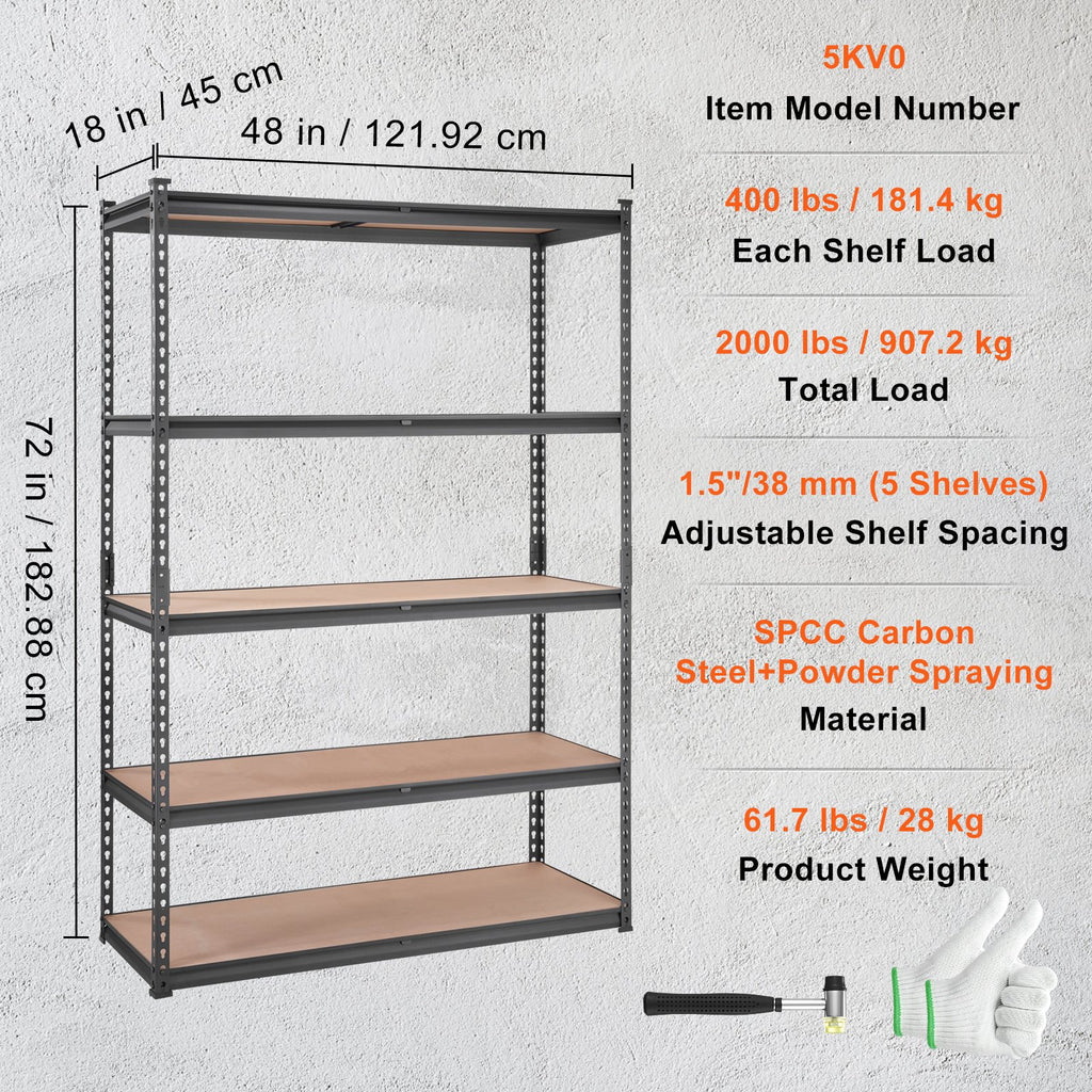 VEVOR Storage Shelving Unit, 5-Tier Adjustable, 907 kg Capacity, Heavy Duty Garage Shelves Metal Organizer Utility Rack, Black, 45D x 122W x 183H cm for Kitchen Pantry Basement Bathroom Laundry Closet