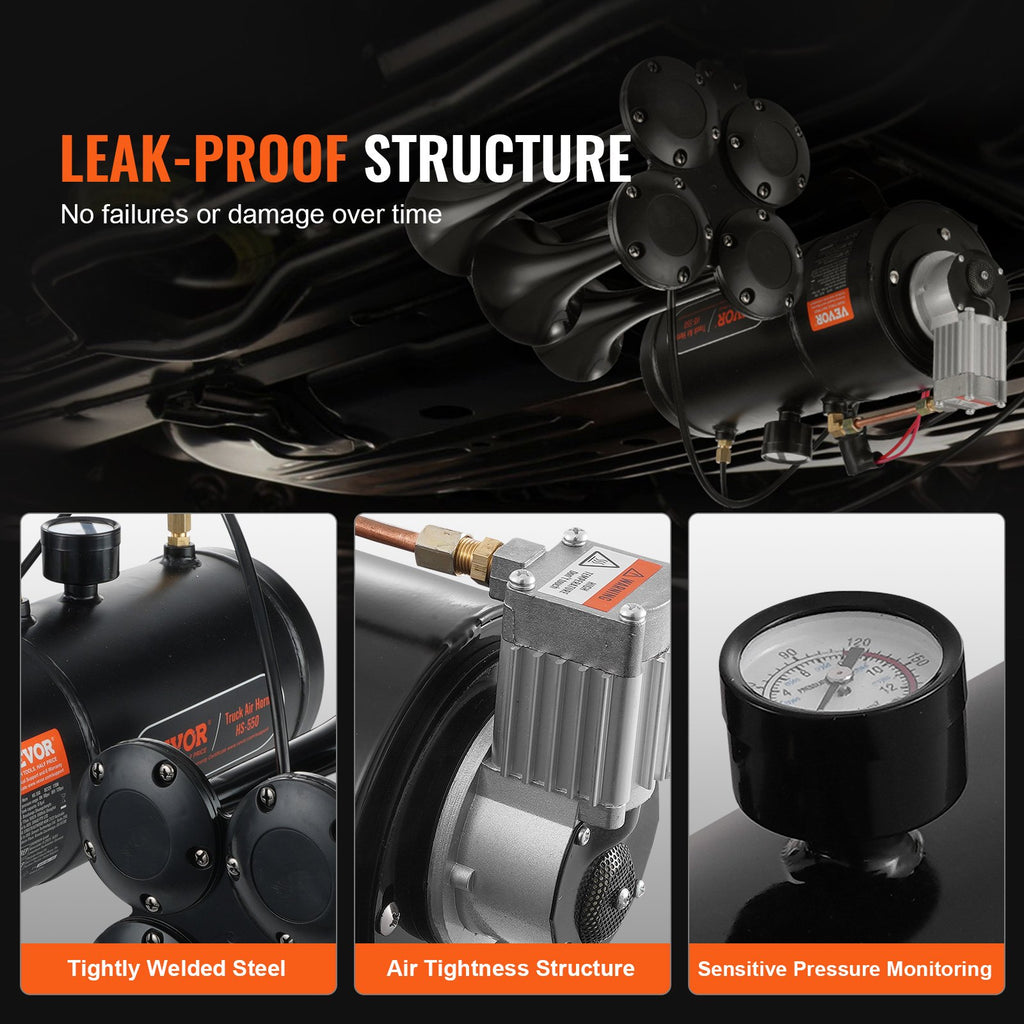 VEVOR Train Horns Kit, 4 Trumpet Air Horn Kit, 150dB Train Horns for Pickup Trucks, 12V 120 psi Air Compressor 0.8 Gal/3 L Tank with Gauge for Any 12V Vehicle Car Truck Train Van Boat