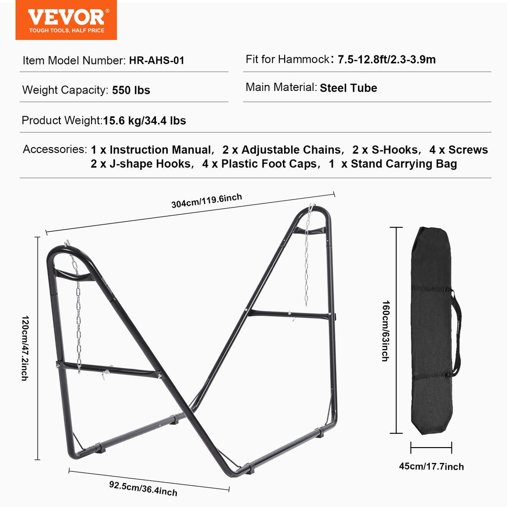 VEVOR Universal 2 Person Hammock Stand, Adjustable Heavy Duty 550 lbs Capacity Hammock Stand Fits 8-13 ft Hammocks for Outdoor and Indoor Portable Hammock Stand with Chain, Hook, and Carrying Bag