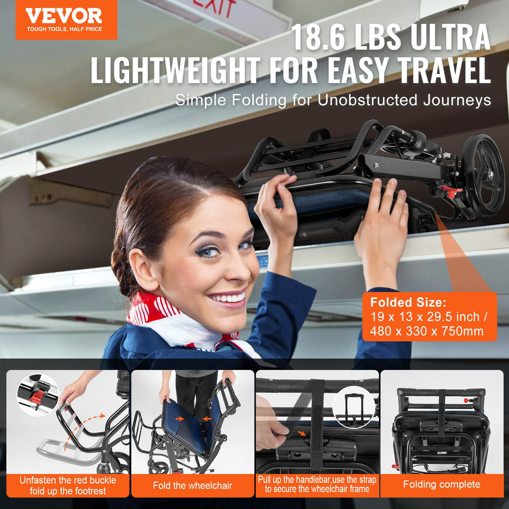 VEVOR Wheelchair, Aluminum Alloy Ultra-Lightweight Transport Chair for Adults, Foldable Cabin Wheelchair with Flip-Back Desk-Length Arms, Self-locking Brake, 15.75-Inch Wide Seat, 220lbs Load